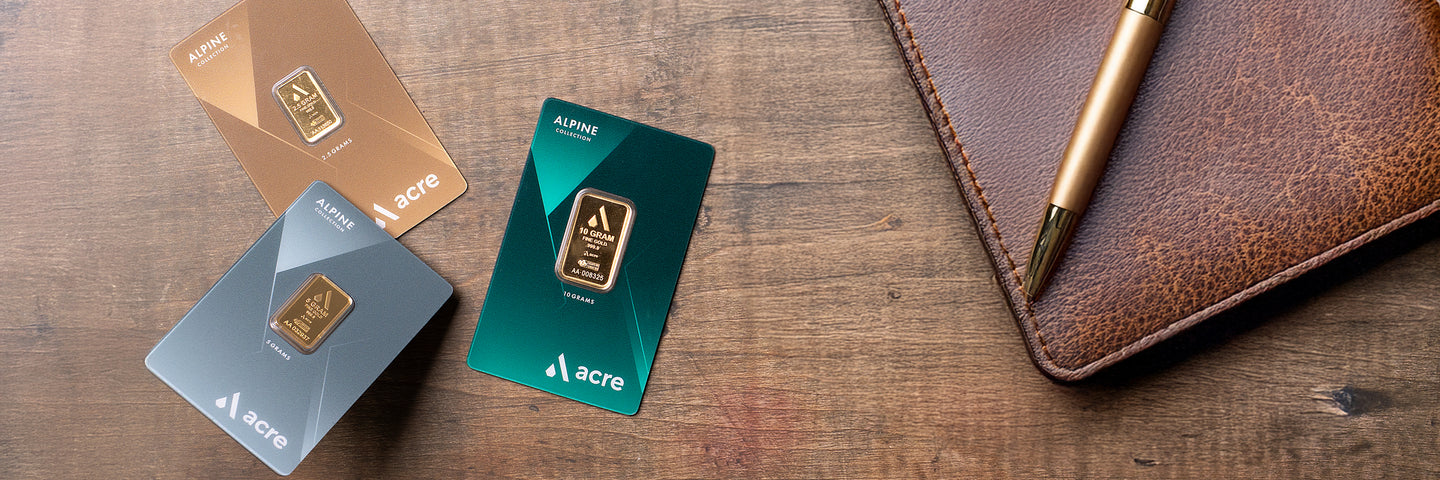 Newly manufactured for Acre. Meet the Alpine Collection, our newest take on the 5g Gold bar. Timeless, thoughtfully designed, and assured to retain value in a way that cash never will. An excellent weight for a first time Gold buyer or for the pro who likes to accumulate their Gold over time, our Gold 5 gram bars are tasteful and refined, with a modern design and mirror-like finish.